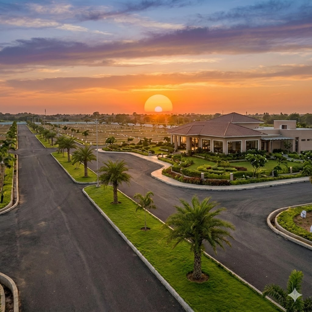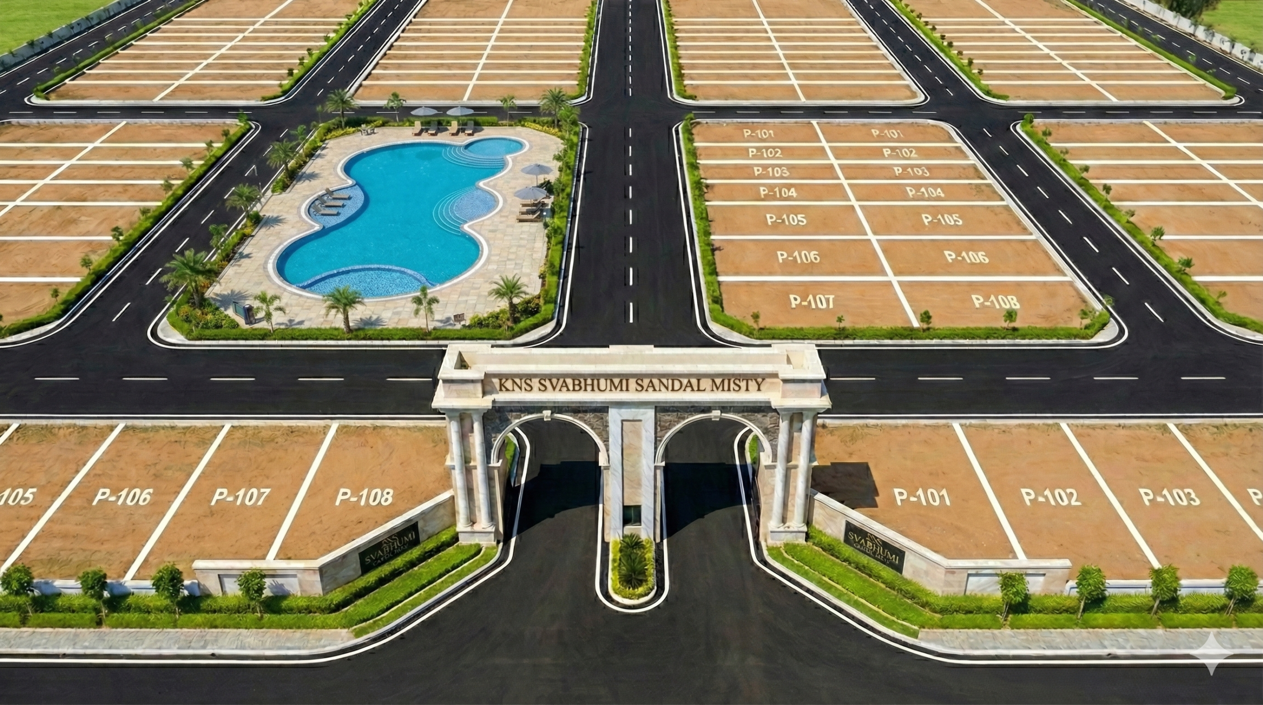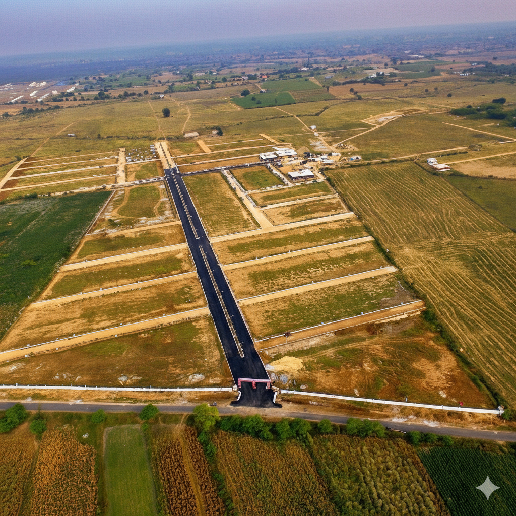 Aerial view of KNS Balaji Enclave residential plots with wide internal roads, approved layout planning, and landscaped green spaces.